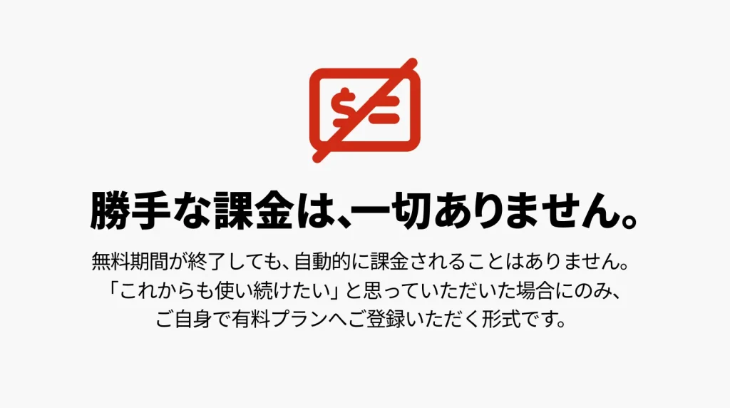 「これからも使い続けたい」と思っていただいた場合にのみ、ご自身で有料プランへ登録していただく形式です 。