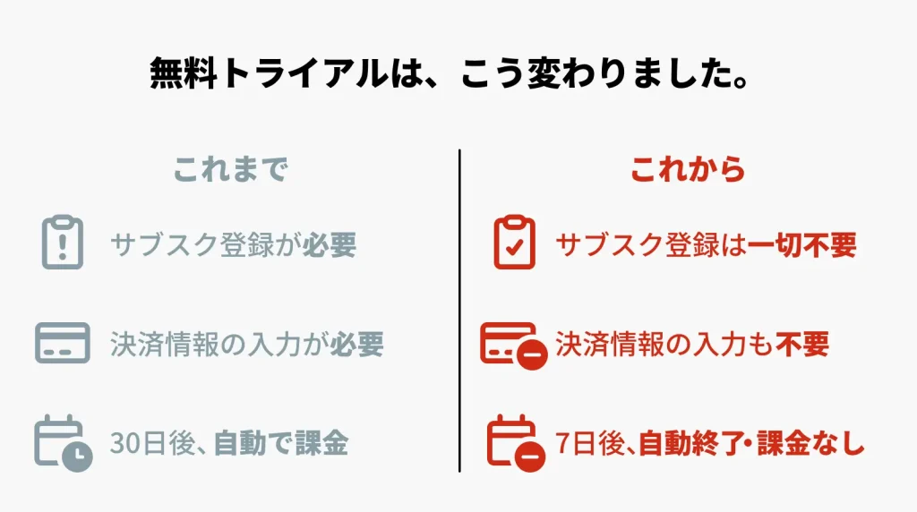 これまで必要だった「事前のサブスクリプション登録」や「決済情報の入力」を一切不要とし、アプリをダウンロードしてすぐに全機能を7日間無料でお試しいただけるようになりました 。