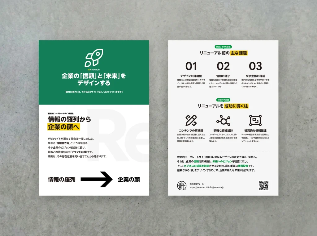 添付の資料(チラシ)では、情報の羅列だったサイトがどのようにして「企業の顔」へと生まれ変わるのか、そのプロセスと視点を分かりやすく図解しております。