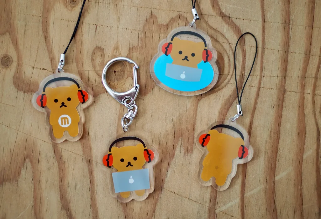 クマが大好きな増井さん。クマと増井さんご自身をモチーフに真っ赤なヘッドホンを付けたDJスタイル。ヘッドホンにはプログラミングにも不可欠な{}があしらわれております。