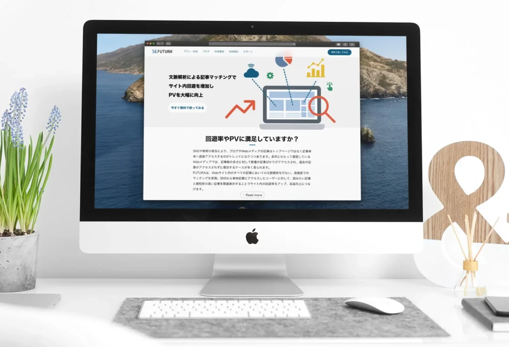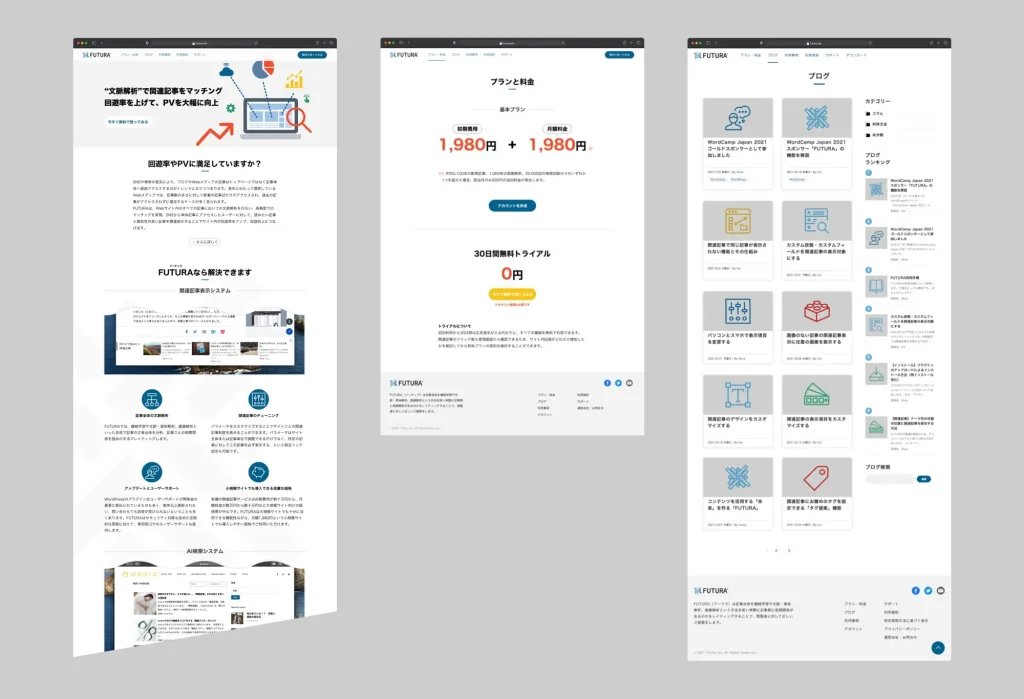 “文脈解析”で関連記事をマッチングする高精度なWordPress関連記事プラグインである「FUTURA(フーツラ)」のブランドロゴをはじめプラグインインターフェイス、Web、リーフレット及び発表会用のKyenoteデザインなど新ブランドのトータルディレクションを担当させていただきました。