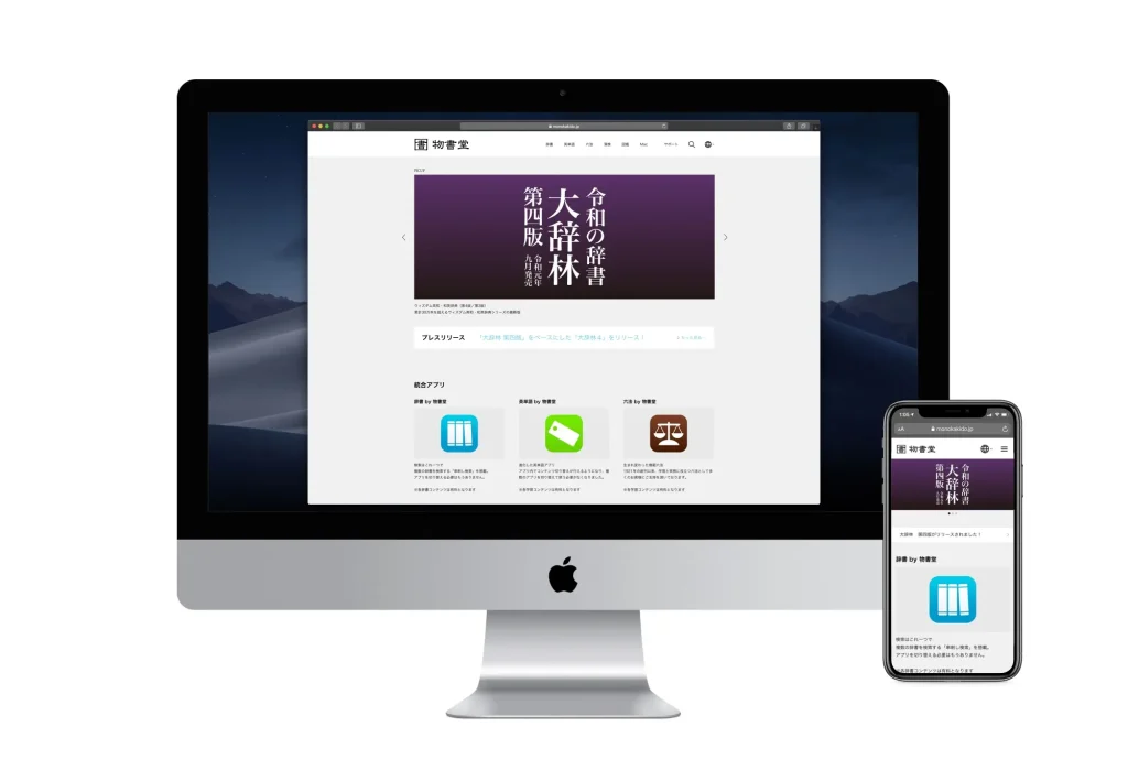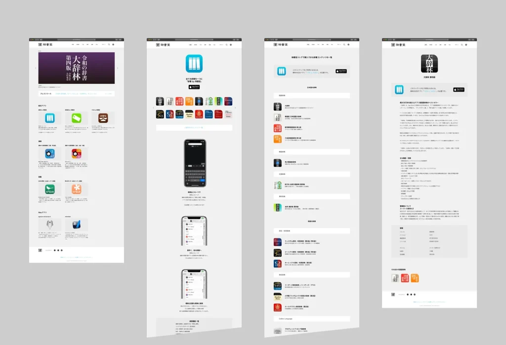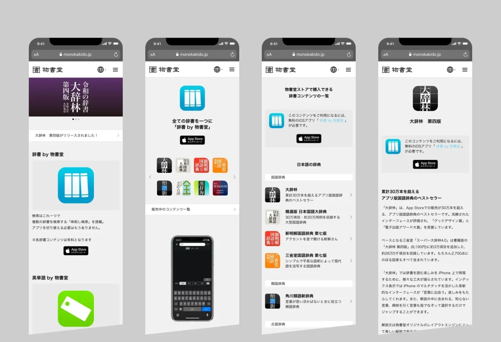 「大辞林」「日本国語大辞典」「英単語ターゲット」など様々なコンテンツを含む、「辞書 by 物書堂」「英単語 by 物書堂」アプリを開発する「物書堂」さんのホームページデザインを担当させていただきました。日本で初めてiPhoneが発売された2008年から一貫してiOSアプリを作り続けている会社です。