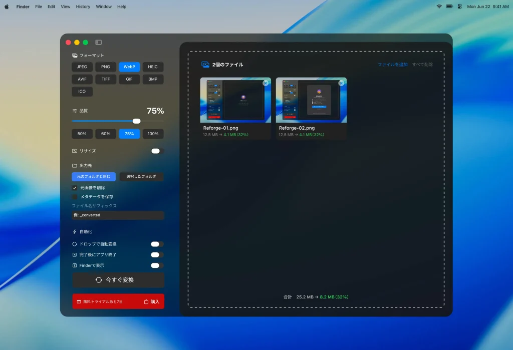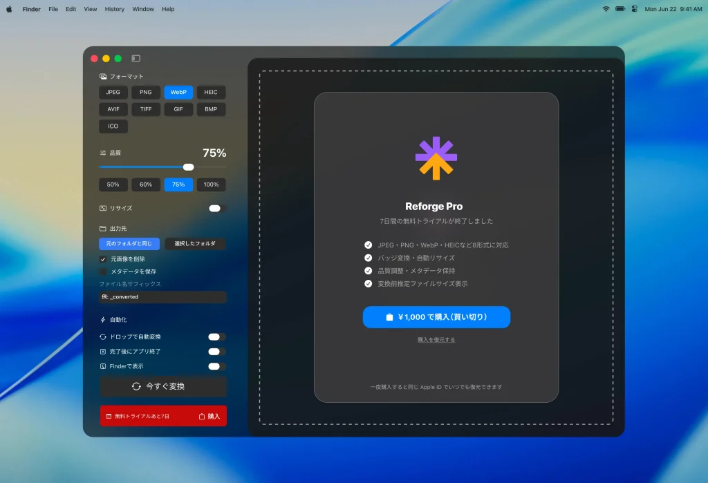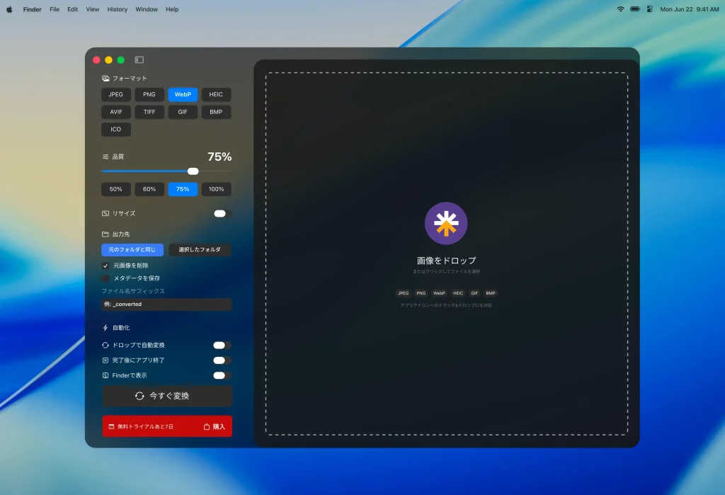 変換後のサイズ推定、品質調整、リサイズ、バッチ処理、自動変換モードなど、画像変換にまつわるすべての機能がここにはあります。7日間の無料トライアルと1,000円の買い切りで、日々の「ちょっとした変換作業」を思考ゼロで完了させます。