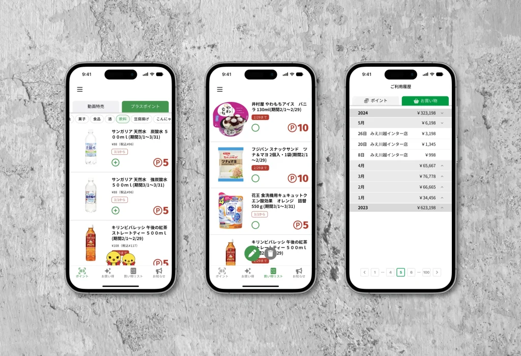 このアプリは、顧客がスムーズに買い物を楽しめるように、バーコード決済機能を備えています。さらに、顧客はアプリを通じてポイントを貯めることができ、お買い得情報や特売のお知らせもアプリ内で確認でき、お買い物リスト機能も利用できます。これにより、顧客は予め必要な商品をリストアップし、効率的且つお得にお買い物が可能となります。